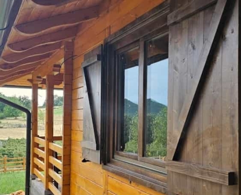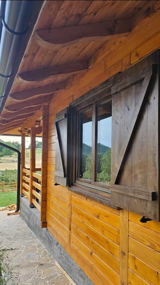 Posebnu autentičnost objektu daju drveni prozori sa pažljivo izrađenim drvenim kapcima za prozore, koji osim estetskog utiska pružaju i praktičnu zaštitu od sunca, vetra i snega. Ovi detalji čine da brvnara odiše tradicionalnim planinskim stilom, a ujedno osiguravaju trajnost i funkcionalnost.